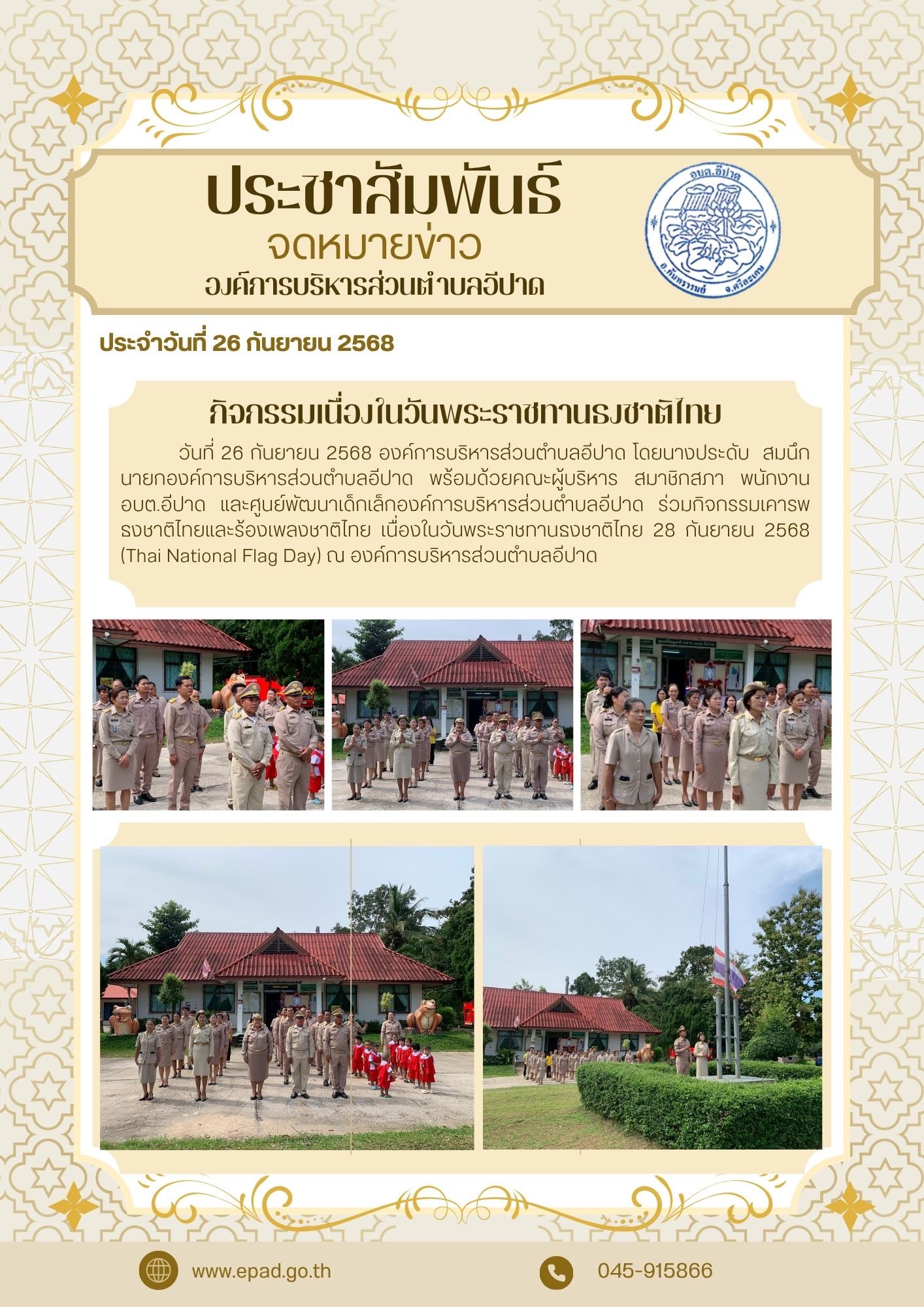 วันที่ 26 กันยายน 2568 องค์การบริหารส่วนตำบลอีปาด โดยนางประดับ สมนึก นายกองค์การบริหารส่วนตำบลอีปาด พร้อมด้วยคณะผู้บริหาร สมาชิกสภา พนักงาน อบต.อีปาด และศูนย์พัฒนาเด็กเล็กองค์การบริหารส่วนตำบลอีปาด ร่วมกิจกรรมเคารพธงชาติไทยและร้องเพลงชาติไทย เนื่องในวันพระราชทานธงชาติไทย 28 กันยายน 2568 (Thai National Flag Day) ณ องค์การบริหารส่วนตำบลอีปาด