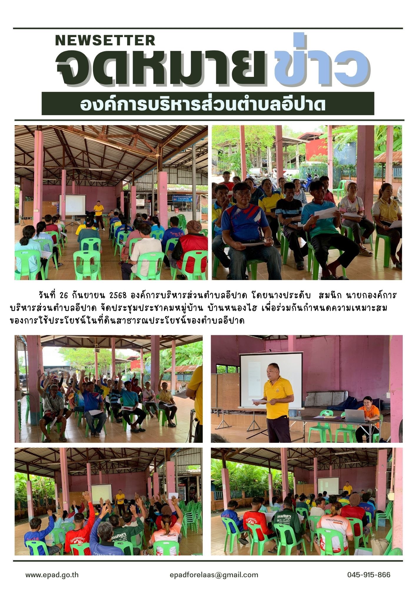 วันที่ 26 กันยายน 2568 องค์การบริหารส่วนตำบลอีปาด โดยนางประดับ สมนึก นายกองค์การบริหารส่วนตำบลอีปาด จัดประชุมประชาคมหมู่บ้าน บ้านหนองไฮ เพื่อร่วมกันกำหนดความเหมาะสมของการใช้ประโยชน์ในที่ดินสาธารณประโยชน์ของตำบลอีปาด