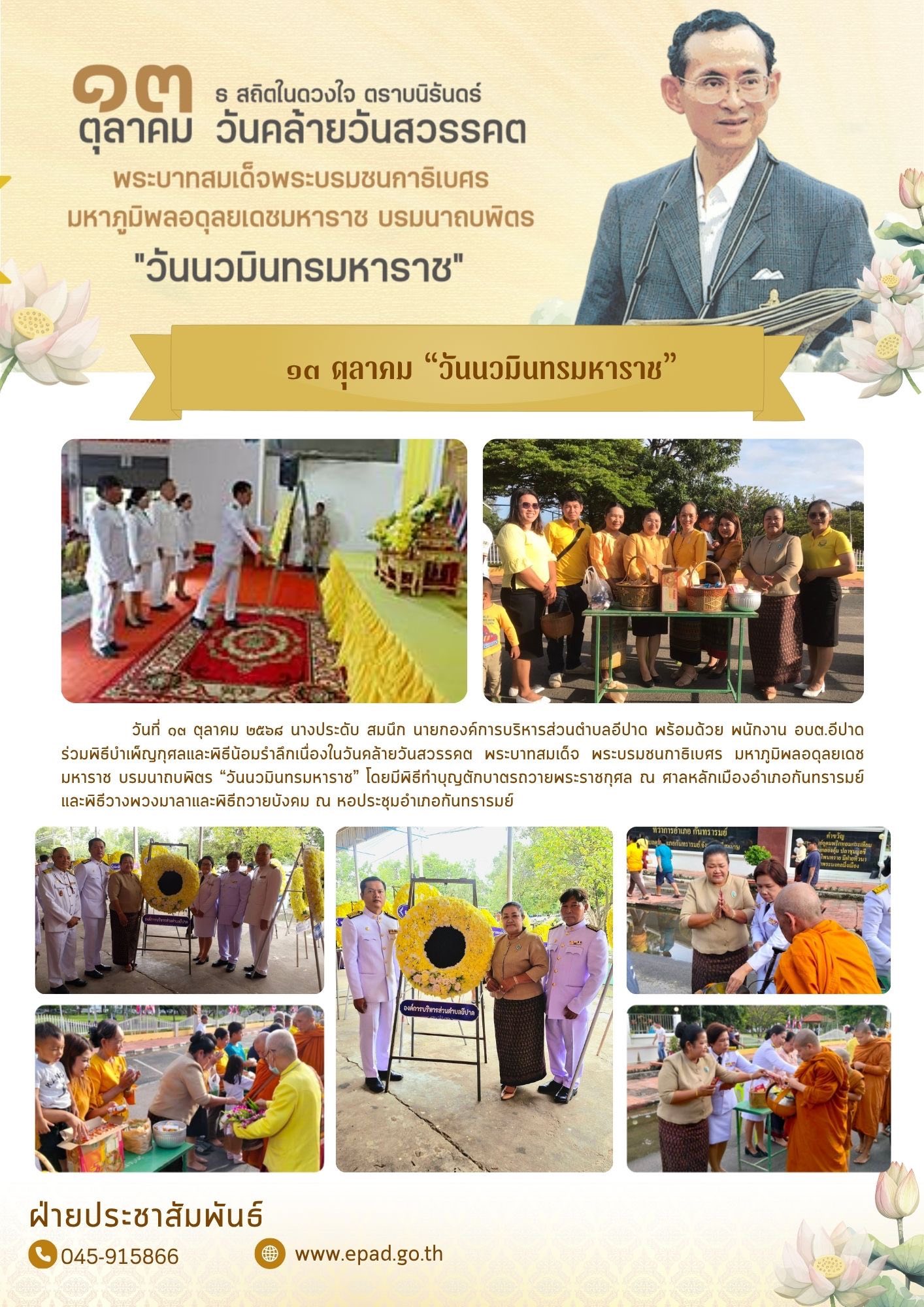 วันที่ ๑๓ ตุลาคม ๒๕๖๘ นางประดับ สมนึก นายกองค์การบริหารส่วนตำบลอีปาด พร้อมด้วย พนักงาน อบต.อีปาด ร่วมพิธีบำเพ็ญกุศลและพิธีน้อมรำลึกเนื่องในวันคล้ายวันสวรรคต พระบาทสมเด็จ พระบรมชนกาธิเบศร มหาภูมิพลอดุลยเดชมหาราช บรมนาถบพิตร “วันนวมินทรมหาราช” โดยมีพิธีทำบุญตักบาตรถวายพระราชกุศล ณ ศาลหลักเมืองอำเภอกันทรารมย์ และพิธีวางพวงมาลาและพิธีถวายบังคม ณ หอประชุมอำเภอกันทรารมย์